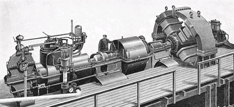 A megoldást végül Charles Algernon Parsons hozta el, aki — Henri Victor Regnault munkásságára építve — elsőként találta meg a saját tengelye körül forgó turbina optimális kialakítását. Parsons első turbinája 1884-ben az akkori viszonyok között döbbenetesnek számító 18 000 1/perc fordulatszámot ért el — mindezt úgy, hogy közben csak minimális rezgést keltett. Ilyen magas fordulatszám mellett pedig a szükséges szinkronfordulat már egy viszonylag egyszerű generátorral is elérhetővé vált…